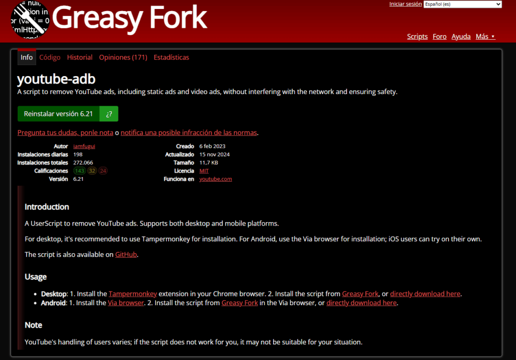 Otra sería probar scripts para eliminar anuncios, para usuarios un poco más avanzados, hay un script en GreasyFork que se llama ‘youtube-adb‘, el cual puedes instalar usando una extensión como ‘Violentmonkey’ o ‘Tampermonkey’